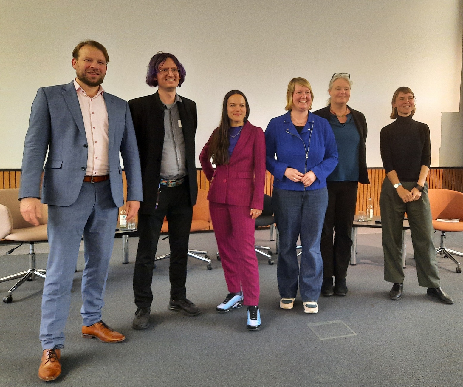 Nach der Podiumsdiskussion: Maximilian Mayer, Benjamin Paaßen, Amrei Bahr, Wiebke Esdar, Katharina Zwieg, Anne Krüger. Foto: Universität Bielefeld