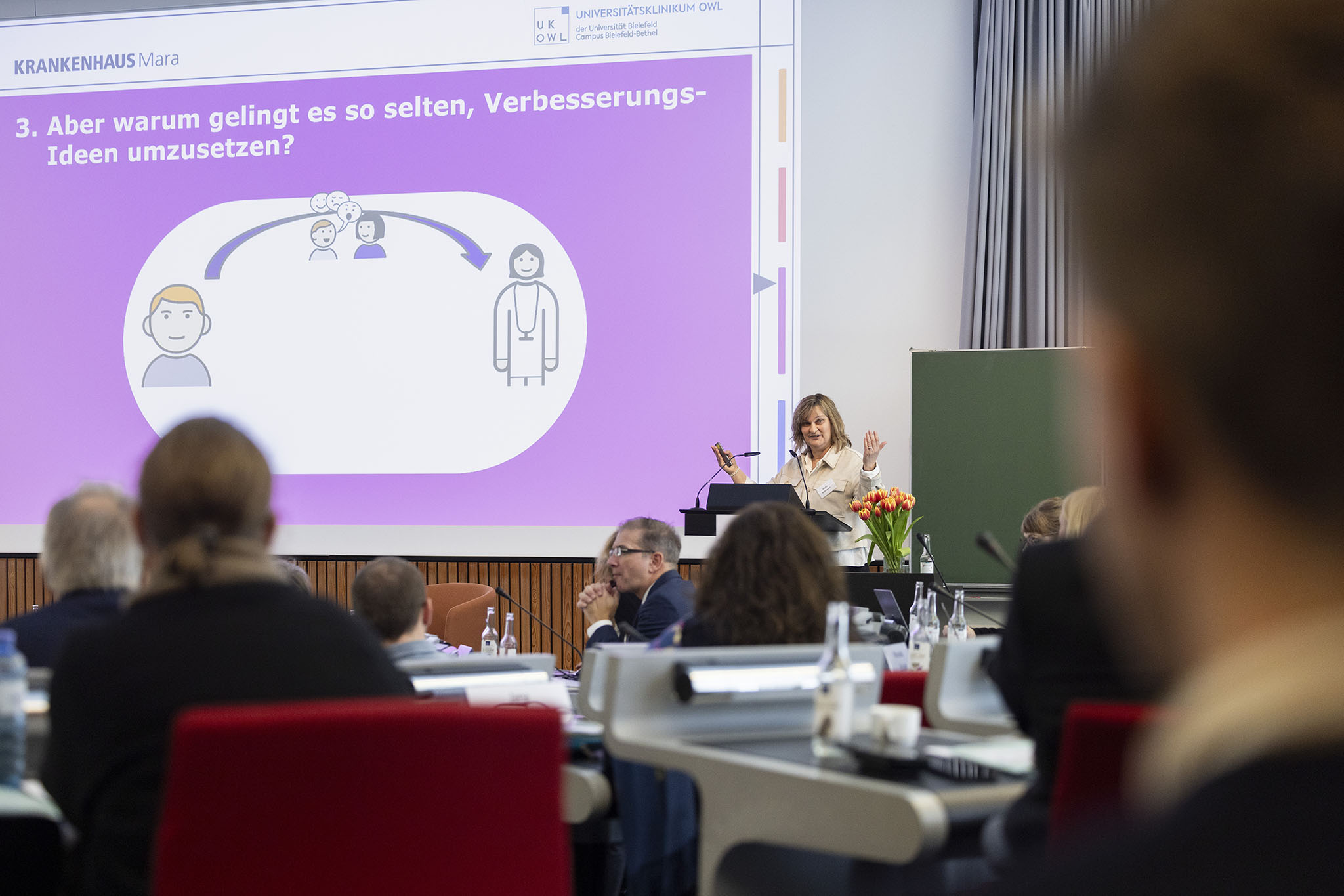 Dr. Meike Wehmeyer, Therapeutische Leitung an der Universitätsklinik für Inklusive Medizin am Uniklinikum OWL, machte in ihrem Vortrag darauf aufmerksam, dass Menschen mit Behinderungen im Gesundheitswesen zahlreiche Hürden zu überwinden haben: sie erkranken häufiger, doch ihre Erkrankungen werden oft nicht erkannt, Beschwerden stattdessen der Behinderung zugeschrieben. Zudem können kognitive, kommunikative oder motorische Beeinträchtigungen zum Beispiel die Wahrnehmung von Arztterminen erschweren, viele Fachkräfte im Gesundheitswesen seien zudem für die besonderen Bedarfe behinderter Menschen nicht hinreichend ausgebildet. Sie präsentierte verschiedene Ansätze, auf diese Herausforderungen zu reagieren, etwa Hilfekonferenzen, bessere Vernetzung, Praktika und Fortbildungen. Ein Thema, das Dominik Urbanczyk, Inklusiver Lehr-Assistent am Uniklinikum OWL vertiefte. Er berichtete von Erfahrungen, die Menschen mit Behinderungen mit dem Gesundheitswesen machen, betonte die Bedeutung verständlicher Sprache und respektvollen Umgangs.